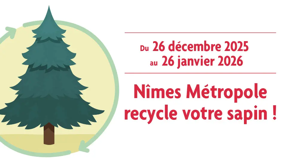 Du 26 décembre 2025 au 26 janvier 2026, Nîmes Métropole en partenariat avec la Ville de Nîmes et les communes qui ont souhaité participer au dispositif : Bernis, Bezouce, Bouillargues, Caissargues, Caveirac, Clarensac, Fons-outre-Gardon, Domessargues, Gajan, Garons, Générac, La Calmette, Langlade, Lédenon, Manduel, Marguerittes, Milhaud, Montignargues, Moulézan, Nîmes, Poulx, Redessan, Saint-Bauzély, Saint-Côme-et-Maruéjols, Saint-Gilles, Sainte-Anastasie et Sauzet vous invitent à déposer votre sapin dans l’un des 96 “Parcs à sapins” ouverts 7j/7 et 24h/24.